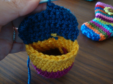 Los calcetines se hacen usando un solo punto (aparte del punto de cadeneta de comenzar). Aquí puede encontrar el paso a paso con imágenes, y una imagen gráfica para mostrar por dónde empezar y dónde terminar, con las partes de colores.